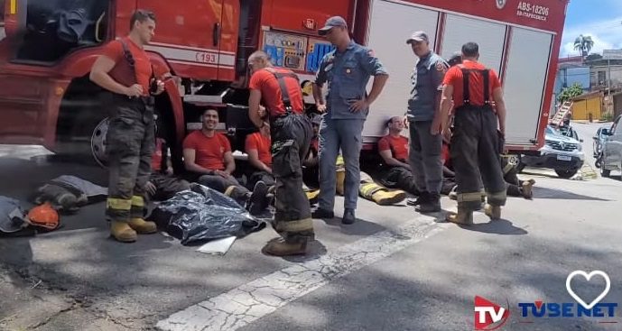 Após 5 horas de trabalho, bombeiros e defesa civil descansam ao lado do caminhão da corporação