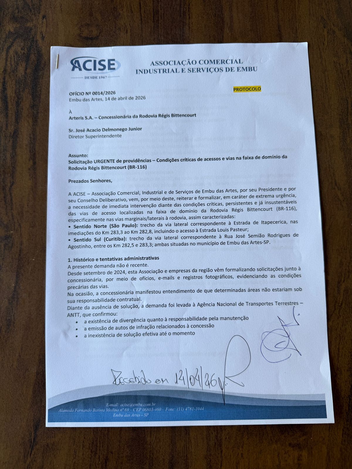 A ACISE protocolou um ofício que relata todo histórico de solicitações formalizadas pela Associação há anos; a situação atual de agravamento contínuo e colapso operacional; os impactos econômicos e sociais; a divergência de responsabilidades e ausência de soluções; e por fim, a solicitação de providências emergenciais.