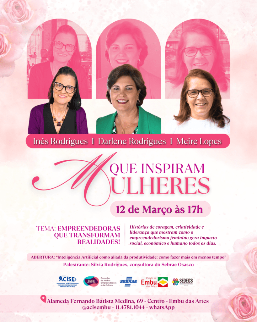 A programação contará com a participação da empresária Inês Rodrigues, da DM5 Produtos Elétricos; da empresária Darlene Rodrigues, da Milho de Ouro Salgadinhos; e da artista plástica Meire Lopes, do Ateliê Mario e Meire, que irão compartilhar suas trajetórias e desafios no mundo dos negócios. A abertura do evento terá a palestra sobre “Inteligência Artificial” com uma especialista do Sebrae Osasco, trazendo orientações estratégicas para quem deseja fortalecer sua presença no mercado.