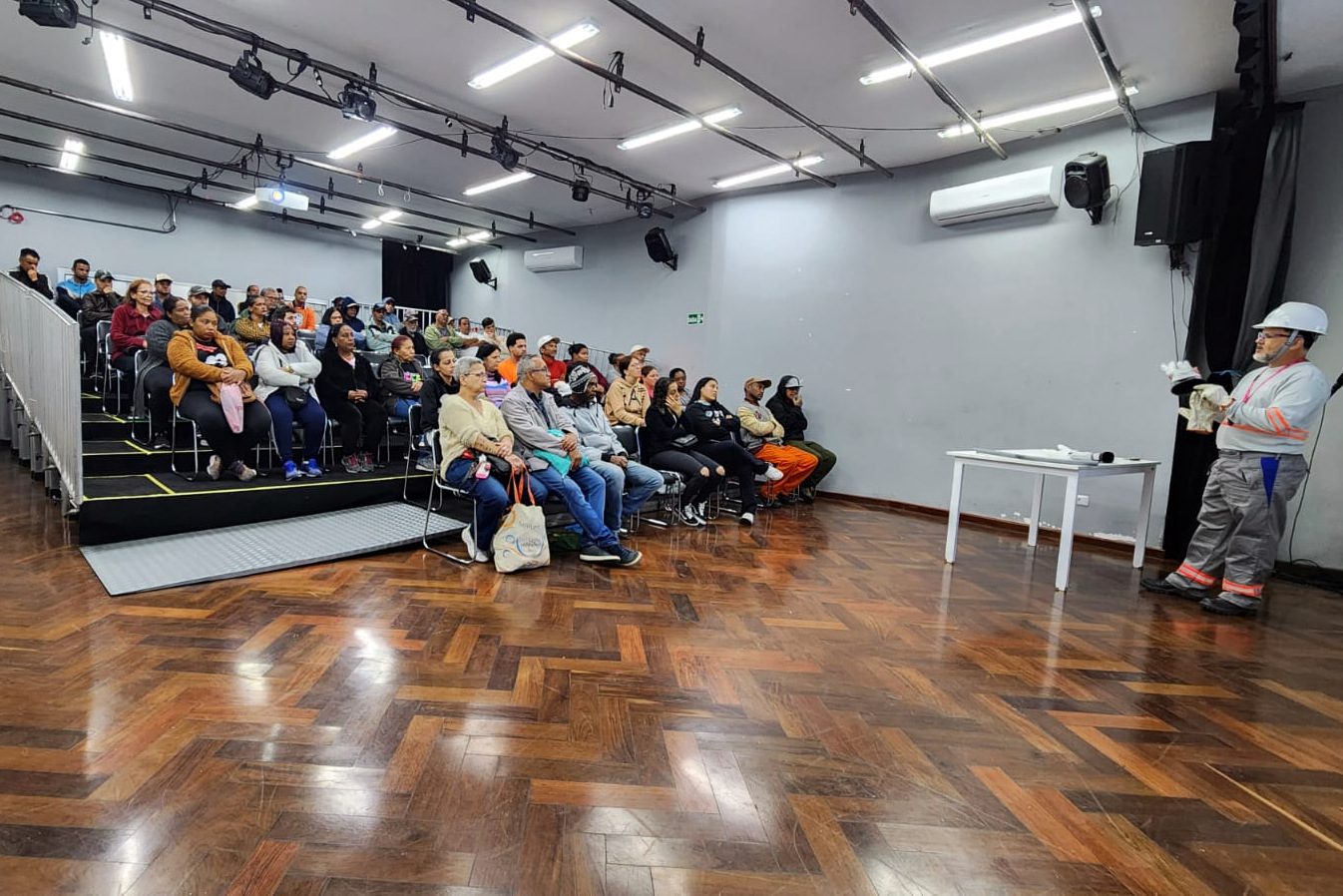 Na manhã desta sexta-feira, 29 de agosto, a Prefeitura de Itapecerica da Serra proporcionou aos bolsistas do Programa Emergencial de Trabalho e Cidadania – Frente de Trabalho, uma importante palestra sobre Riscos Elétricos. Ministrada pelo eletricista Julio Cesar Teixeira, da Enel São Paulo, o encontro aconteceu na Praça dos Esportes e da Cultura (PEC da Secretaria de Cultura), no Jardim Paraíso, reunindo integrantes do programa.